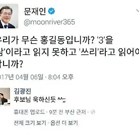 세상의 흔적 썸네일형 리스트형 3D와 이산화가스 3을 '삼'으로 '쓰리'로 또는 '셋' 으로 읽어야 할때가 있다.그냥 조크로 끝날일이 왜 이리 시끄러울까?그것은 다시금 자신의 행동을 돌아봐야 한다. 이산화가스 발언으로 조롱받던 사람이 생각 나기 때문 아닙까?.물론 이산화가스 발언을 하신분의 수준이 정말 ......그 수준이 였지만 .... 그 당시 그렇게 조롱하고 장난치던 사람들이 당신 지지자들이 때문이다. 역지사지로 생각해 봐야 하지 않을까? 그래서 '쓰리'이던 '삼'이던 '셋'이던 당신의 수준도 검증이 필요해 보입니다.책임지는 정치를 하신적 본적이 없습니다. 무슨 일만 생기면 지지자들 뒤에 숨어서 방패막이로 지지자들을 쓰시는것만 봤습니다.법안 제출 몇개 하셨나요?아니 본인이 책임지고 한 선거에서 이긴적있나요? 손수조와의 선거에서 이긴것을 빼고는 없.. 더보기 이전 1 2 3 4 5 6 ··· 20 다음